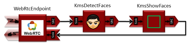 This application shows an example on the use of Multisensory (i.e. a buffer of metadata synchronized with the media stream) in Kurento. The Media Pipeline implemented in this application is composed by a WebRtcEndpoint connected first to a KmsDetectFaces Media Element, which detects faces in a media stream. The data about the timing and position of the detected faces is published in the metadata buffer. This information is read by another Media Element called KmsShowFaces, which draws a square at the time and position published in the metadata buffer. To run this demo follow these steps: