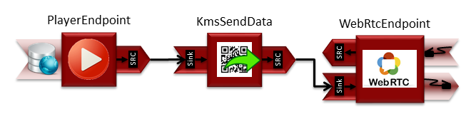 This application shows an example on the use of WebRTC Data Channels with Kurento. The Media Pipeline is composed by a PlayerEndpoint which feeds media a KmsSendData. This Media Element is a test element aimed to show the capabilities of Kurento Media Server for Data Channels. Internally it is composed by a ZBarFilter, which is another Media Element that detects Bar/QR codes in a media stream. This information is sent as WebRTC Data Channel Metadata by KmsSendData to the last element of the pipeline, i.e. a WebRtcEndpoint. In the client side the WebRtcPeer is setup in receive-only mode, and the received data is shown in the GUI. To run this demo follow these steps: